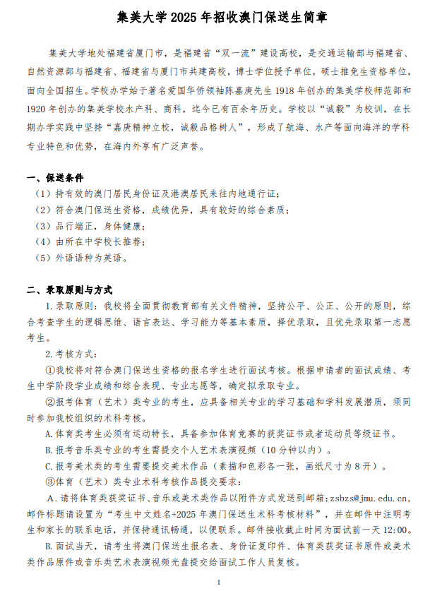 集美大学2025年招收澳门保送生简章
